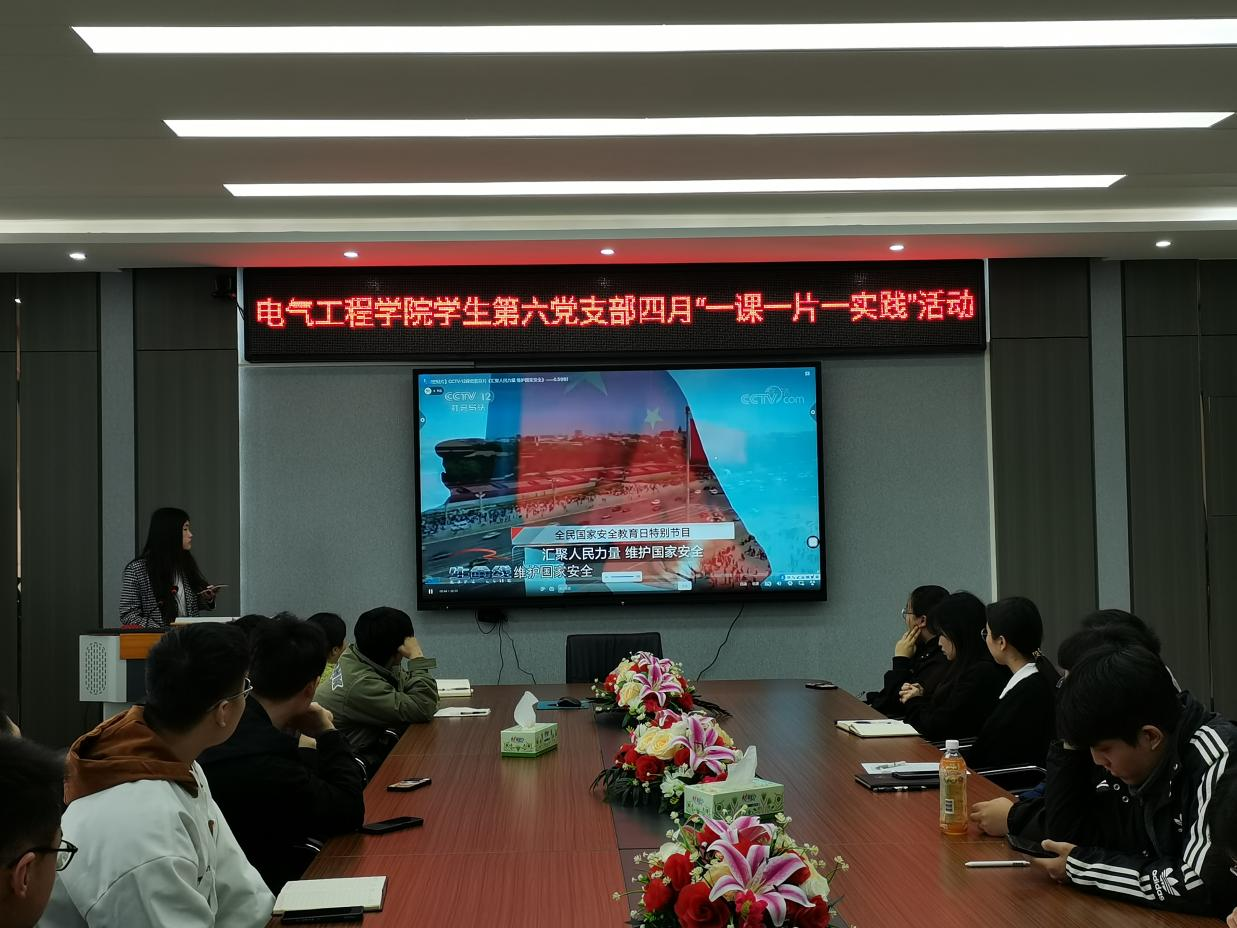 会上,学生第六党支部组织委员杨苗苗以“全民国家安全教育”为主题给全体与会人员上党课。随后,支部组织全体学生观看保密教育片《汇聚人民力量 维护国家安全》。该教育片通过对国防、军事等多个涉及不同国家安全领域的案例进行讲述,为全体学生上了一堂生动鲜活的国家安全教育课。最后,支部组织全体学生在校园开展国家安全知识宣传实践活动。