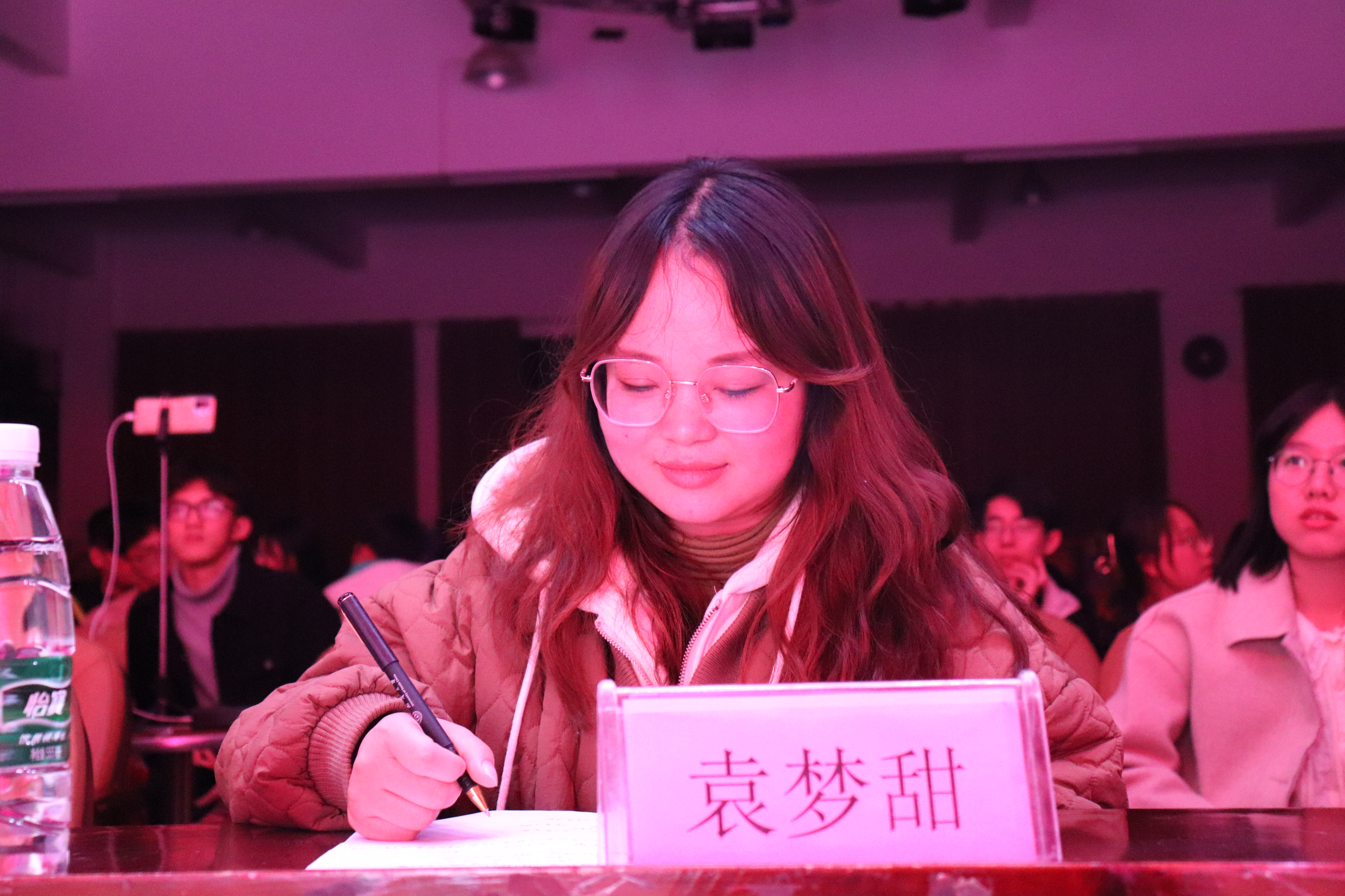 大赛最后,袁梦甜老师代评委席对节目点评。袁梦甜肯定了同学们的努力,赞扬了同学们的积极贡献,为同学们的青春活力喝彩。她仔细地点出每个节目的优点,表达了老师对同学的关心与肯定。