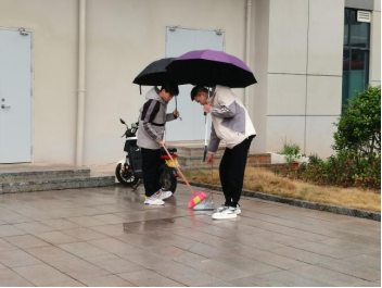 活动期间,同学们分工明确、各司其职、配合有序。学院大楼前,同学们撑伞在雨中清扫台阶上的脏物、拾捡水池中的垃圾;学院大楼内,同学们整理大厅内陈设物品、擦拭窗户、打扫地面;学生宿舍内,同学们整理内务、打扫卫生并消毒杀菌。在同学们齐心协力的劳动和无私奉献的付出下,学院大楼、学生宿舍都变得一尘不染、焕然一新。