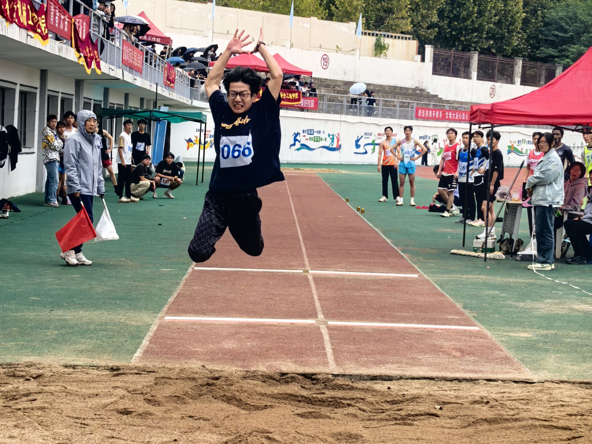 在激烈的三级跳远预决赛中,胡方志同学沉着冷静,助跑精准有力,起跳果断决绝,三次腾空如猎豹般矫健,最终以12.51米的优异成绩打破了保持2021年的校运会纪录12.47米,夺得该项目冠军。这一跃,不仅跃出了电气学子的风采,更跃出了追求卓越的精神高度。