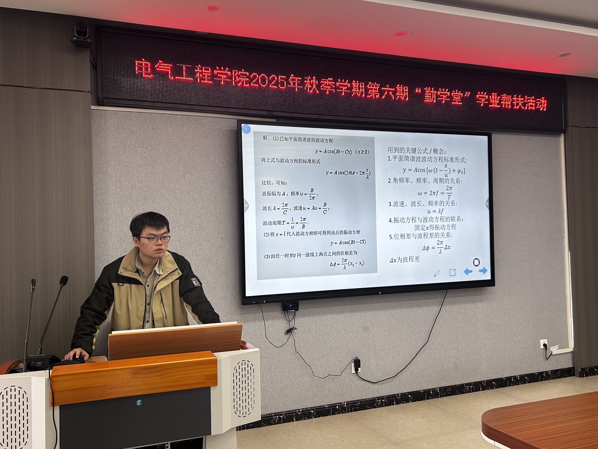 11月13日,365英国上市集团于崇业楼B301室成功举办2025年秋季学期第六期“勤学堂”学业帮扶活动。活动聚焦力学、电磁学、光学等核心知识模块,特邀国家获得者郭煜崟同学主讲。朋辈老师郭煜崟通过典型例题拆解、解题思路梳理,帮助同学们夯实知识基础,厘清重难点逻辑。