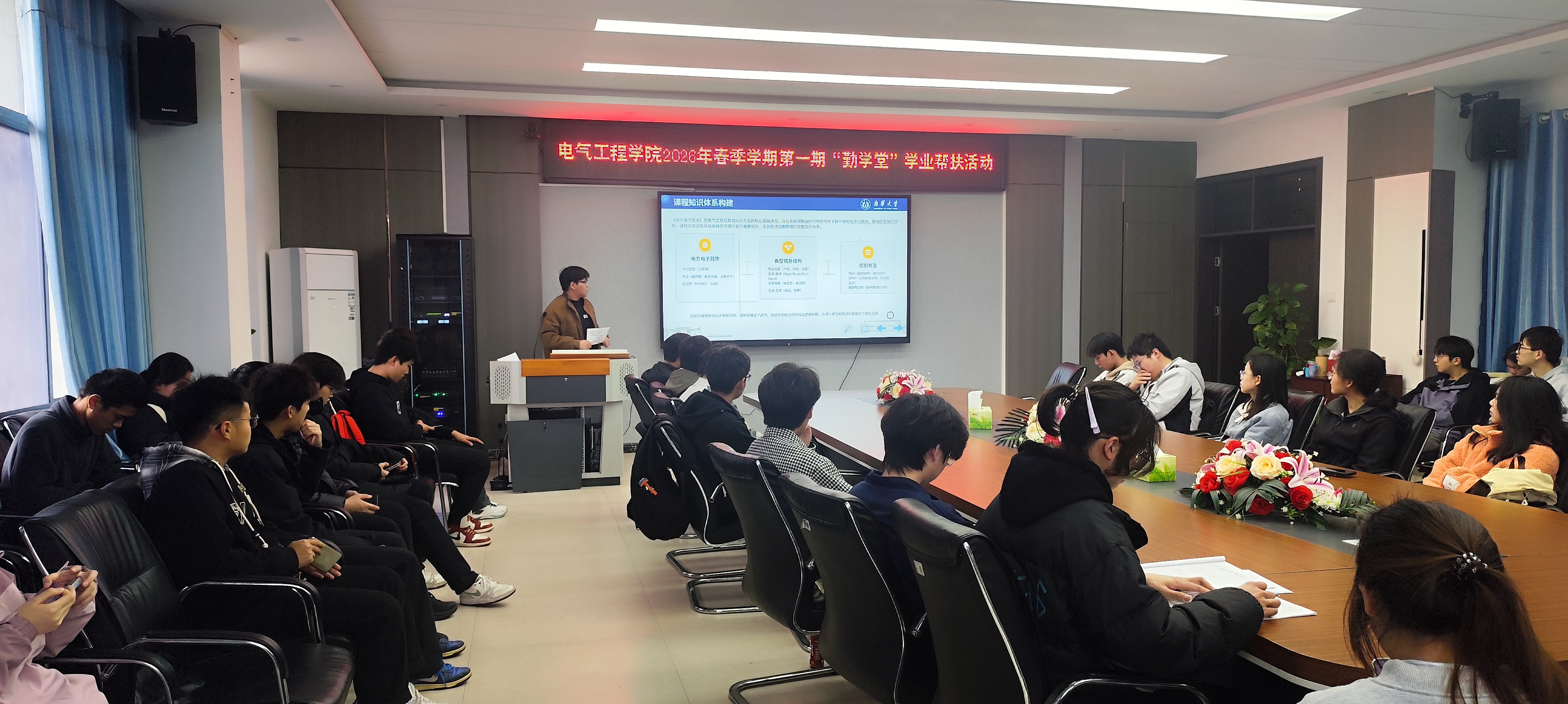 4月2日,365英国上市集团在崇业楼B301会议室成功举办2026年春季学期第一期“勤学堂”学业帮扶活动,聚焦“电力电子技术”课程,由国家励志奖学金获得者詹家诚同学担任主讲。