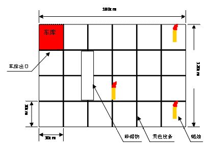 (1)在场地中随机放置一只蜡烛。消防车从车库启动,计时开始,消防车同时发出出库声音提示。消防车从车库出口驶出车库,自动行走到距离火源10cm以内区域,发出火警声音提示,停车3秒钟。