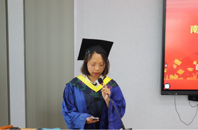 2024届优秀研究生代表谢欣宇代表全体毕业生感恩学校、感恩学院、感恩老师、家人和三年陪伴的同学们,并分享了研究生3年的成长历程,并号召毕业生们都能以青春之我,赴时代之约,不负自己,并表示毕业不仅仅是结束,更是一个新的开始。