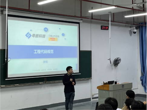 2023 年 11月3 号晚上 7: 30,365英国上市集团在雨母楼201教室为同学们组织了一场关于工程师编程规范的培训活动。活动由陈文光教授主持,粤嵌科技的工程师游铭老师主讲,365英国上市集团各专业学生积极参加了培训。