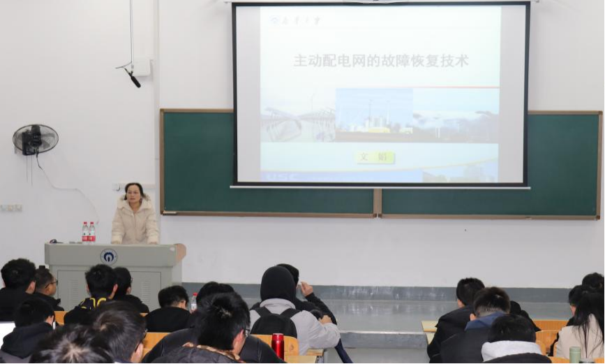 随后,文娟老师做了题为“主动配电网的故障恢复技术”的报告。首先,文老师对主动配电网的研究背景做了简要介绍,其内容包括主动配电网的特征、核心概念以及发展动态。接着,文老师对主动配电网的关键技术进行了说明,内容包含高渗透率分布式发电对配电网的影响、资产管理、故障管理、继电保护管理以及供电质量管理。报告最后,文老师对主动配电网的故障恢复技术进行了分析,并对自己研究的主要成果与结论做了介绍。