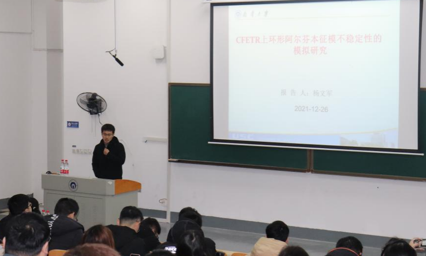 接着,杨文军老师进行名为“CFETR 上环形阿尔芬本征模不稳定性的模拟研究”的报告。杨老师首先从“太阳为什么能发出光和热?”的问题引出了本次报告的主题:核聚变。接着向同学们介绍了受控核聚变研究概况,随后对其研究生期间工作“CFETR上环形阿尔芬本征模线性不稳定性研究”的数值模拟方法(NOVA/NOVA-K)、平衡参数设置以及CFETR上的TAE稳定性计算向同学们做了说明。最后,杨老师向大家介绍了粒子碰撞对环形阿尔芬本征模非线性演化的影响研究。