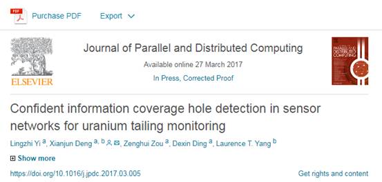 无线传感器网络(Wireless Sensor Networks, WSN)在环境监测、桥梁健康监测、精细农业、铀尾矿库周边区域放射性污染等多个工业领域得到了广泛应用。网络覆盖是无线传感器网络感测服务质量的一种度量,它反映和刻画一个区域被感测程度的优劣,是衡量WSN性能的重要指标之一。无线传感器网络中因节点初始随机部署不均、节点能量匮乏而失效及不可抗力对节点的破坏等因素产生的覆盖空洞将严重影响网络的感测和覆盖质量。为了有效的定位和检测覆盖空洞,论文基于新颖的可信信息覆盖模型,充分挖掘和利用所监测的物理变量本身所蕴含的空间相关特性,采用地质统计学中广泛应用的普通克立金估值作为重建和估值函数,利用高斯变差函数对所监测的物理变量进行建模,设计了一系列有效的启发式方案对覆盖盲区进行检测,并利用图像处理法提取覆盖盲区边界。仿真结果表明:论文提出的可信信息覆盖空洞检测方法可以有效检测可信信息覆盖空洞,优化网络覆盖性能,提高网络服务质量。该研究成果:“Confident Information Coverage Hole Detection in sensor networks for uranium tailing monitoring”于2017年3月在信息科学领域著名学术期刊《Elsevier Journal of Parallel and Distributed Computing》发表,英国正版365首页为第一作者单位,邓贤君副教授为通讯作者。