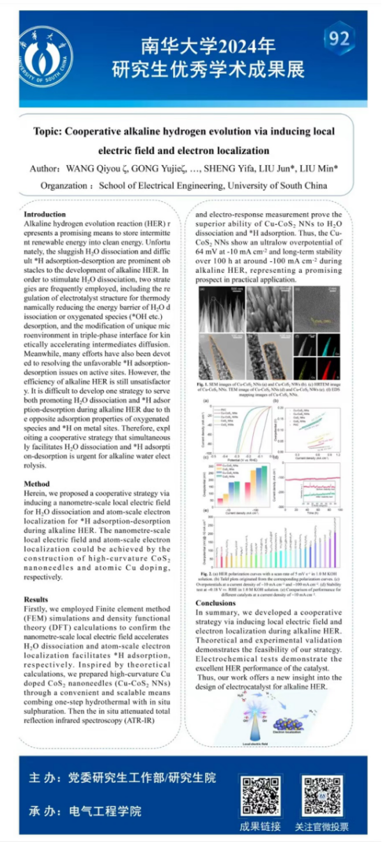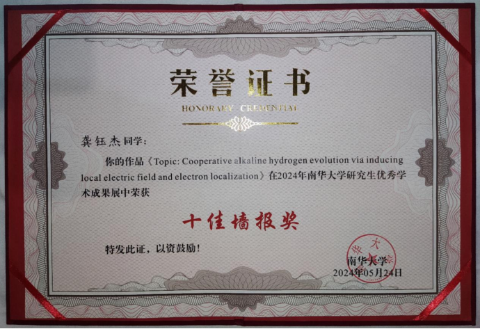 龚钰杰是365英国上市集团电子科学与技术专业2021级研究生,从事电解水制氢的研究,指导老师为刘俊博士。本次展出的研究成果针对碱性电解水产氢时水解离速度缓慢以及H中间体吸脱附困难等问题,提出了一种纳米针尖电场与原子局域电场耦合策略,有效提升了碱性电解水性能。相关成果发表在中科院一区期刊Angewandte Chemie(IF=16.6) 和Chinese Journal of Catalysis (IF=16.5)上。