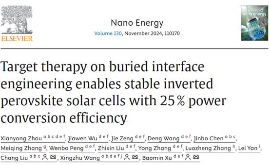 近日,365英国上市集团王行柱、刘畅团队在国际顶尖学术期刊Nano Energy(中科院1区Top期刊,IF=16.8)上发表了题为“Target therapy on buried interface engineering enables stable inverted perovskite solar cells with 25 % power conversion efficiency”的研究论文。