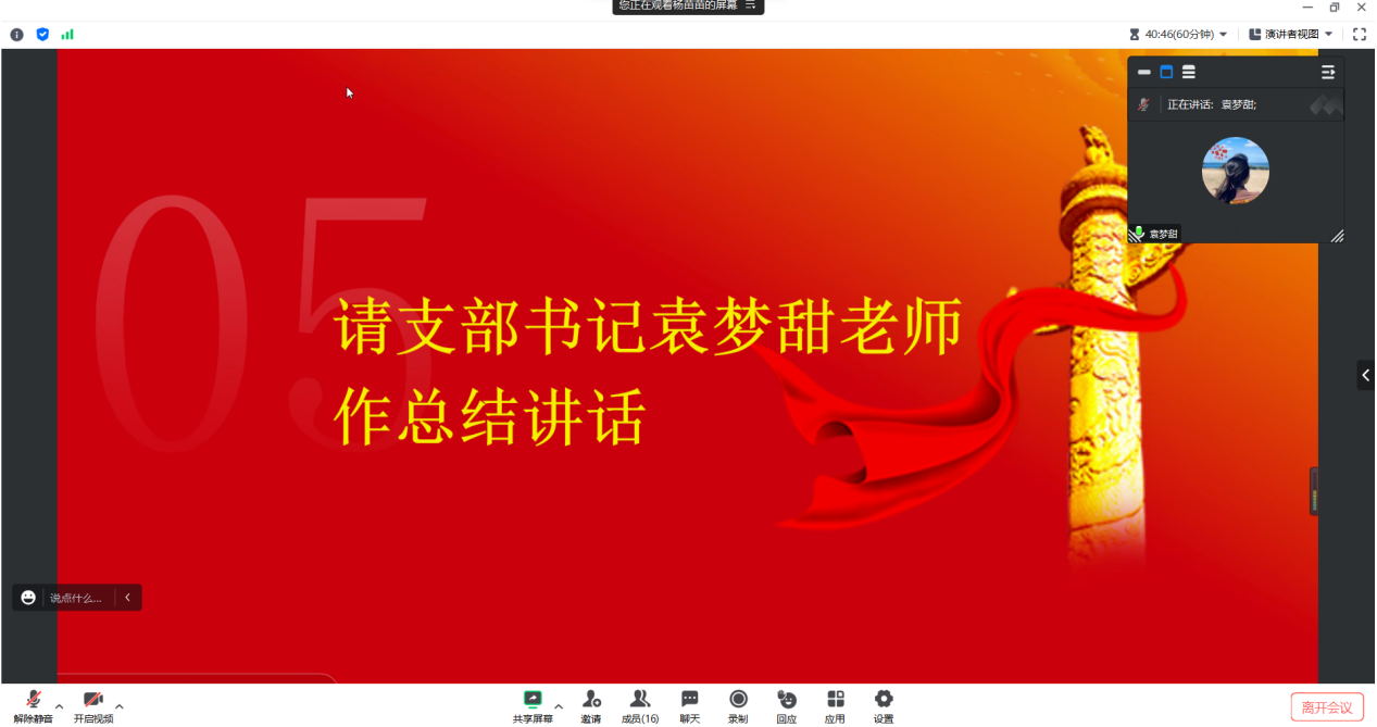 最后,支部书记袁梦甜老师做总结讲话。她肯定了支委会成员在组织开展本次党课中的表现与发挥,并勉励同学们要自主加强理论知识学习,要读原文悟思想。随后,她就支部党员积极参加暑期三下乡活动、积极投身志愿服务的精神表示了赞赏,希望大家以他们为榜样,在今后多参加志愿活动,为社会做贡献,将理论知识运用到实践当中去。